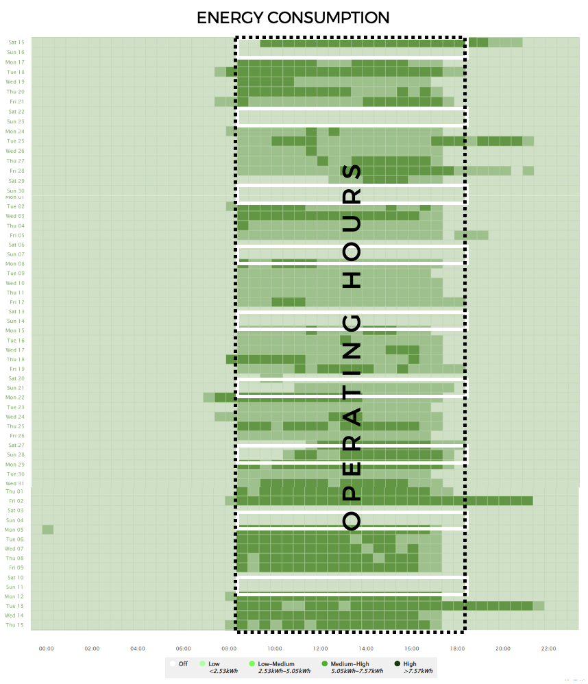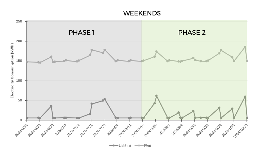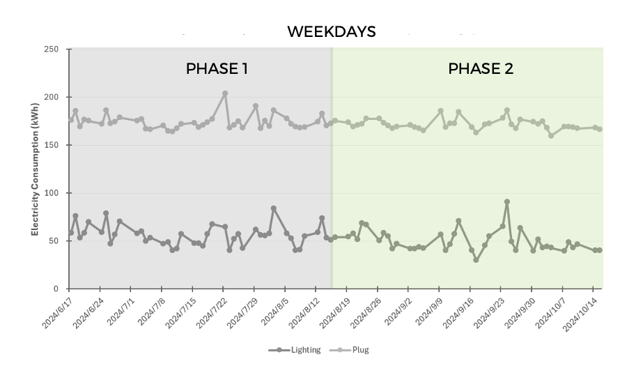 We grouped hourly electricity consumption data to identify typical usage patterns and spot differences between the two monitoring phases. With BEE Sense tools like Operation Analyzer and Action Tracker, we analyzed hourly trends to understand how usage varied between weekdays and weekends and to highlight areas of inefficiency.